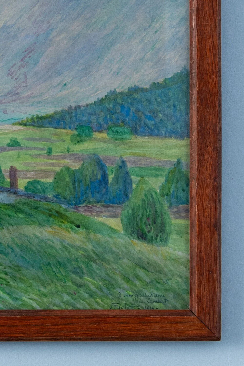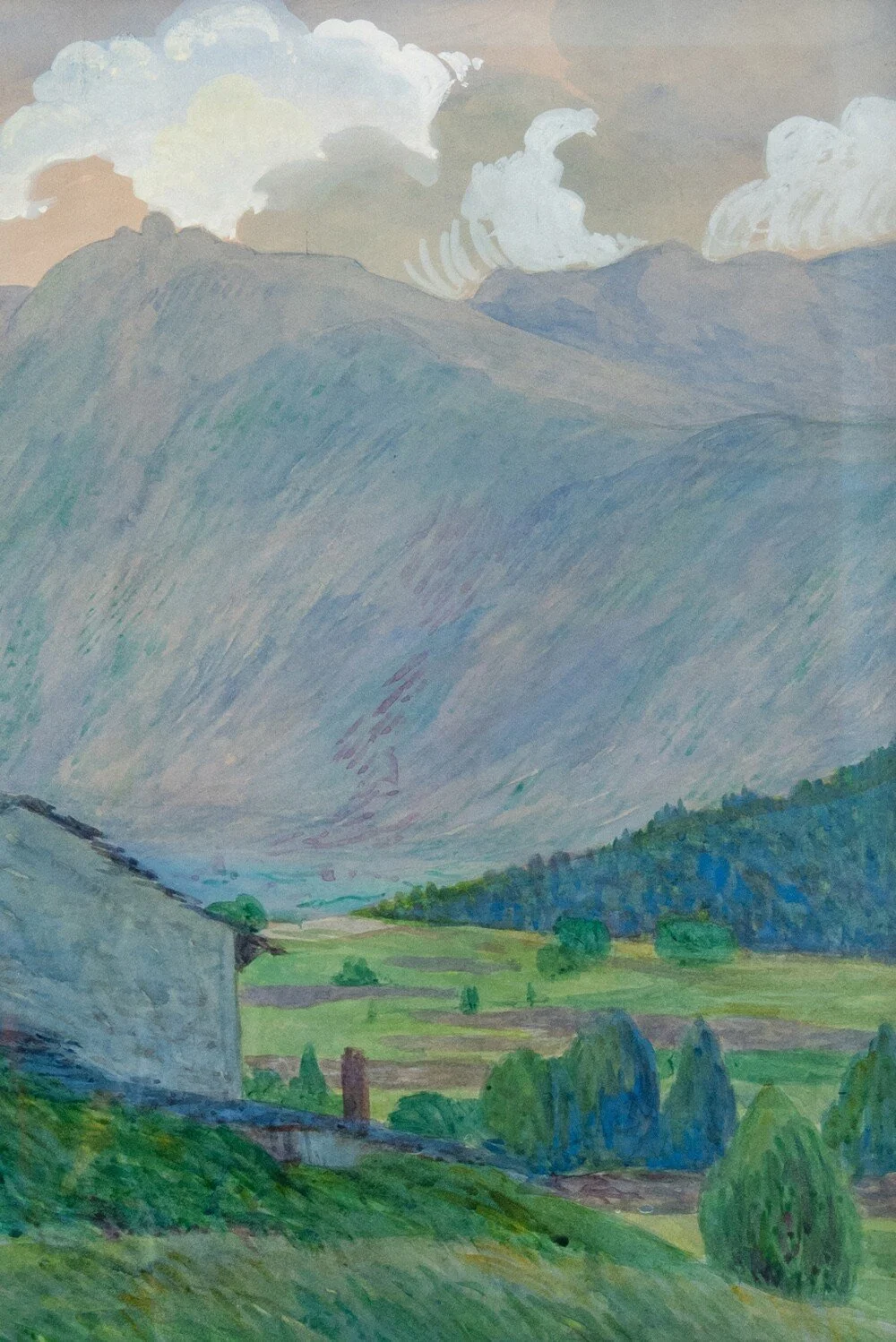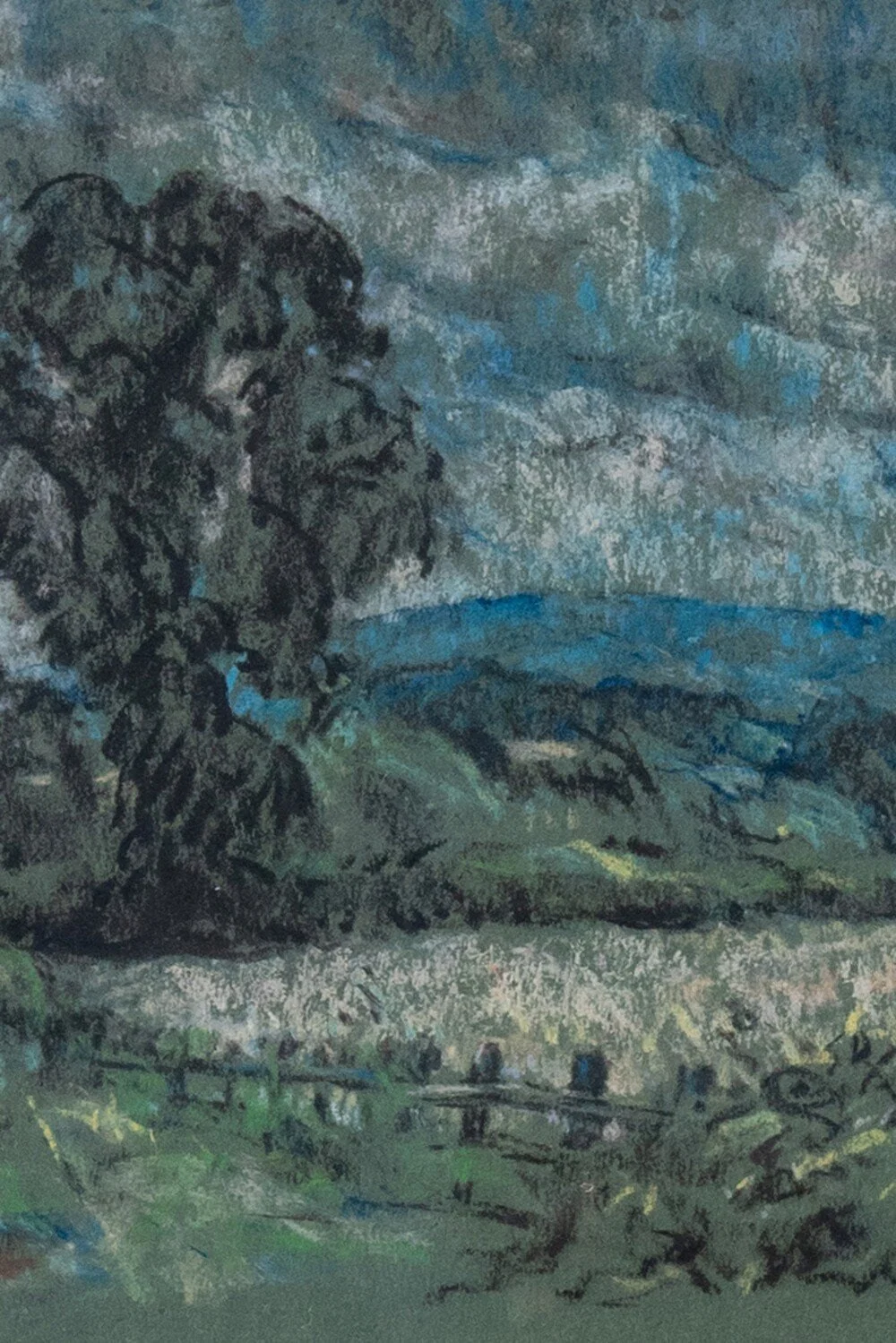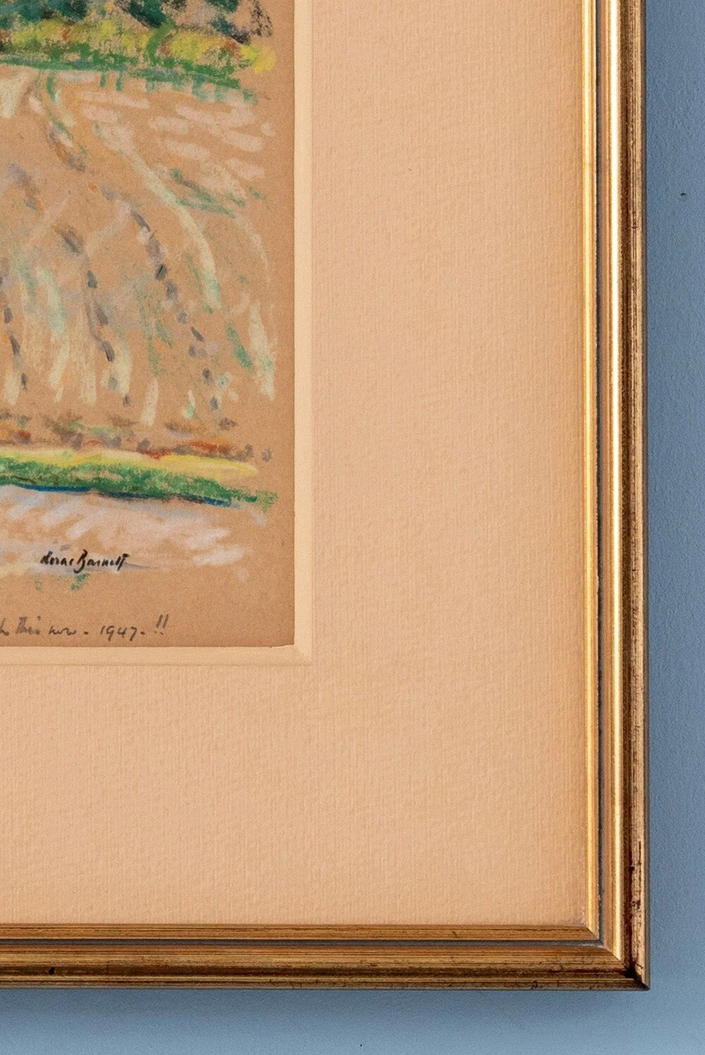 This early 20th-century pastel on paper by British artist Walter Durac Barnett (1876–1961) depicts a coastal landscape with rocks in the foreground, the sea beyond, and cliffs in the distance. Executed on light brown paper, it captures the shifting light and textures of the shoreline through a vibrant palette of blues, greens, yellows, and blacks.