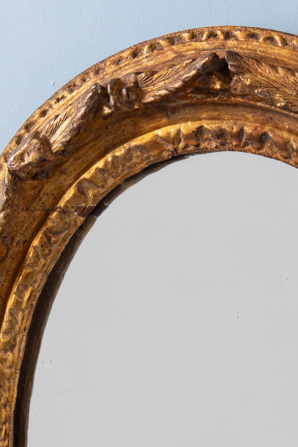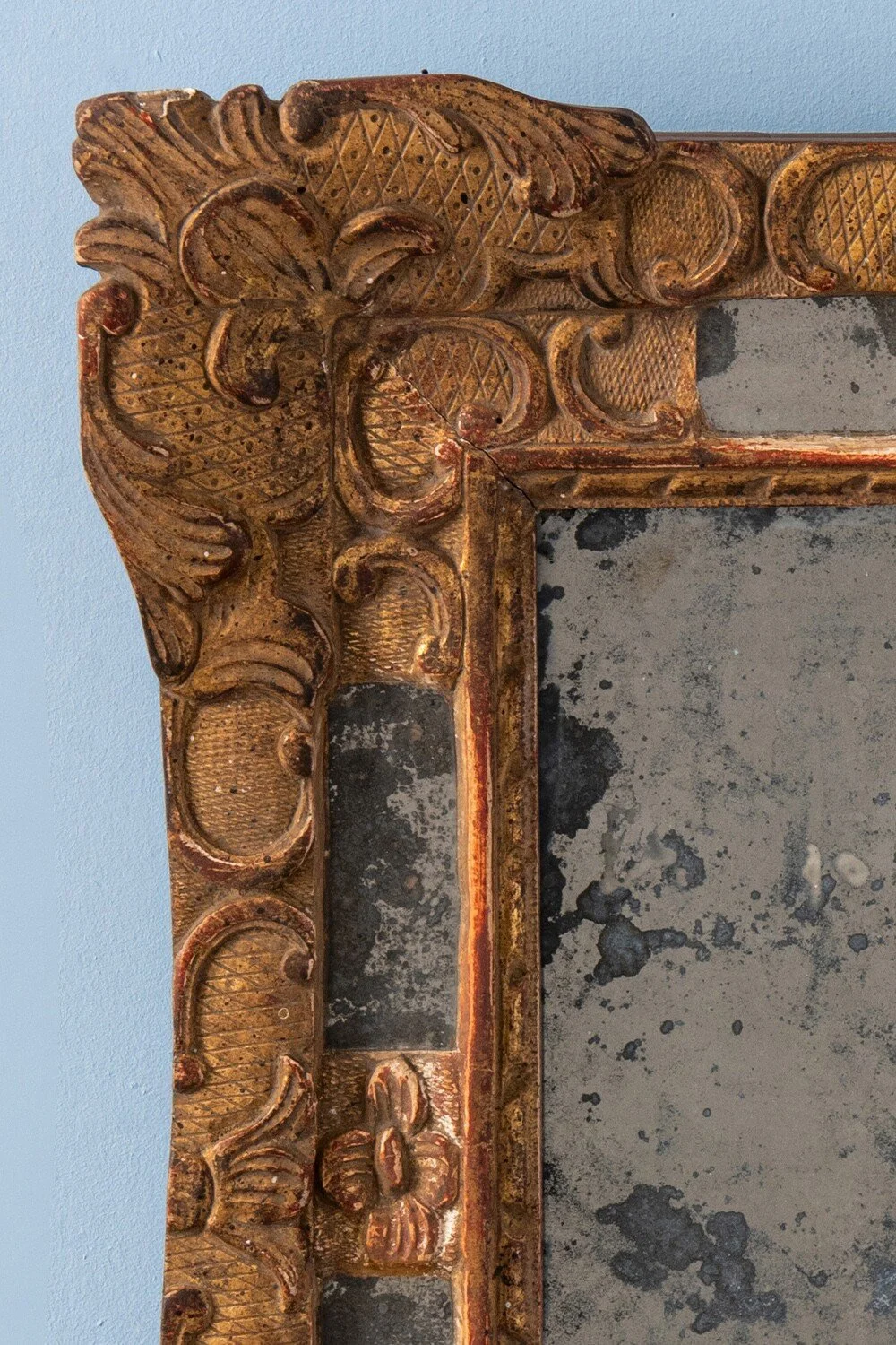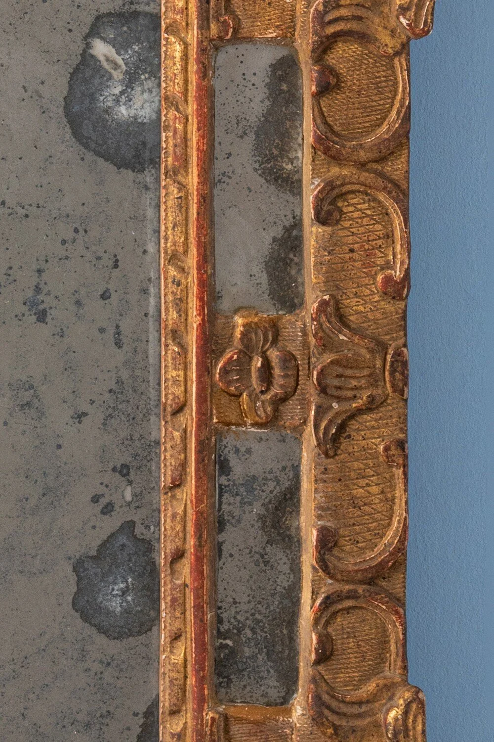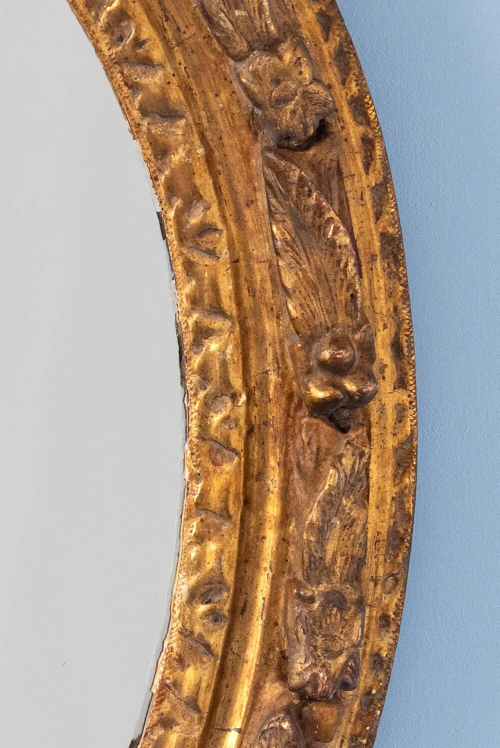 This 19th-century French giltwood mirror features a sumptuous crest of a lyre, surrounded by flowing scrolls of flowers and foliage. The rectangular mirror plate is adorned with an ornate frieze of relief flowers, finished with two pilasters at the bottom. The original mirror plate displays attractive foxing, adding character. This distinctive 19th-century mirror, composed of earlier elements, makes a unique statement piece.