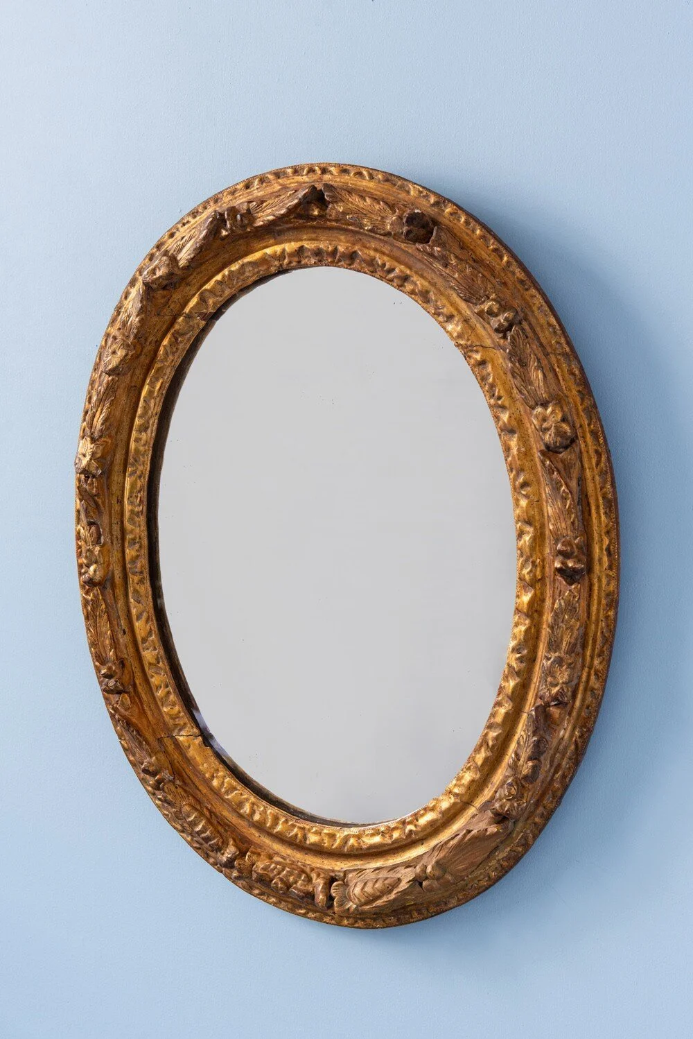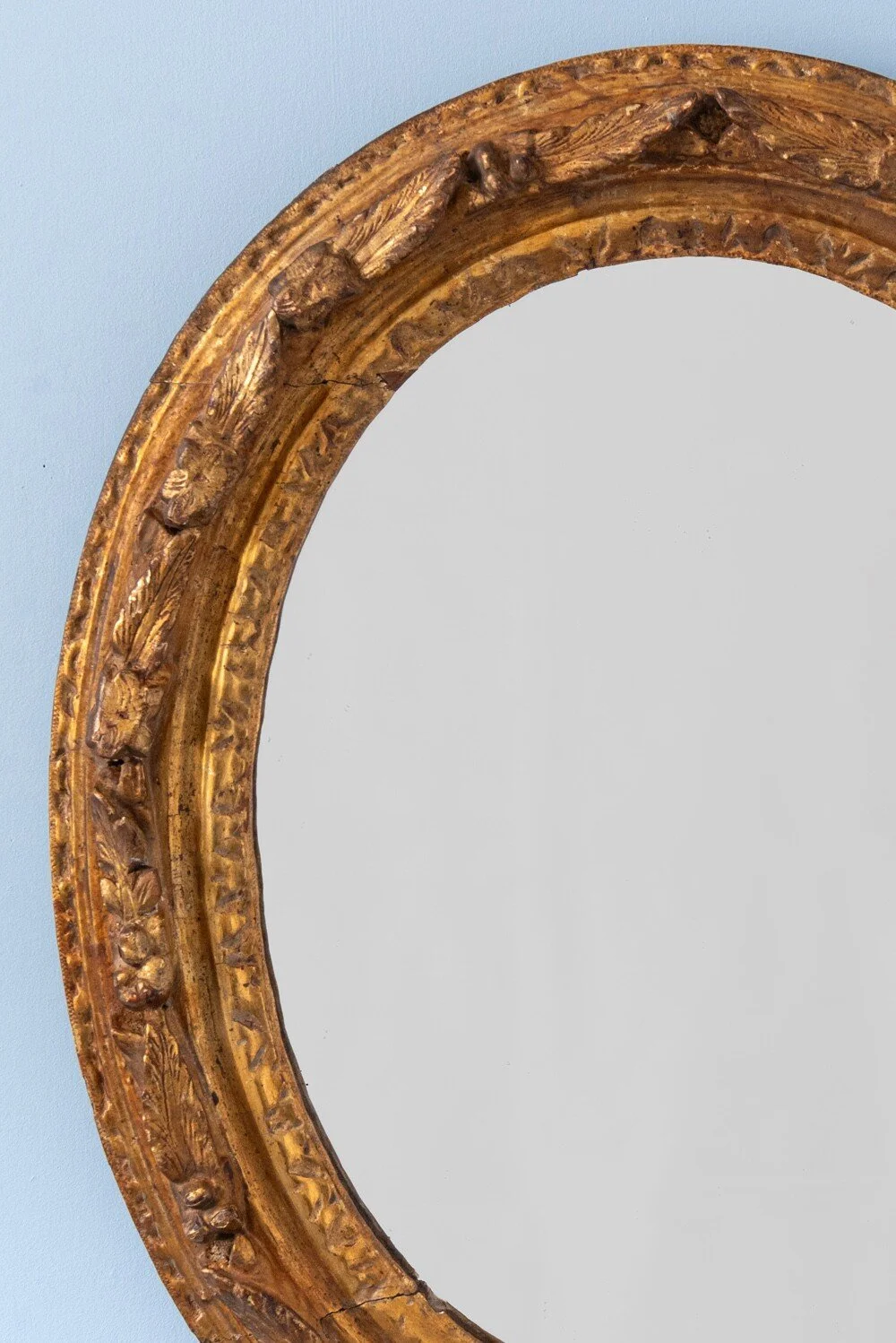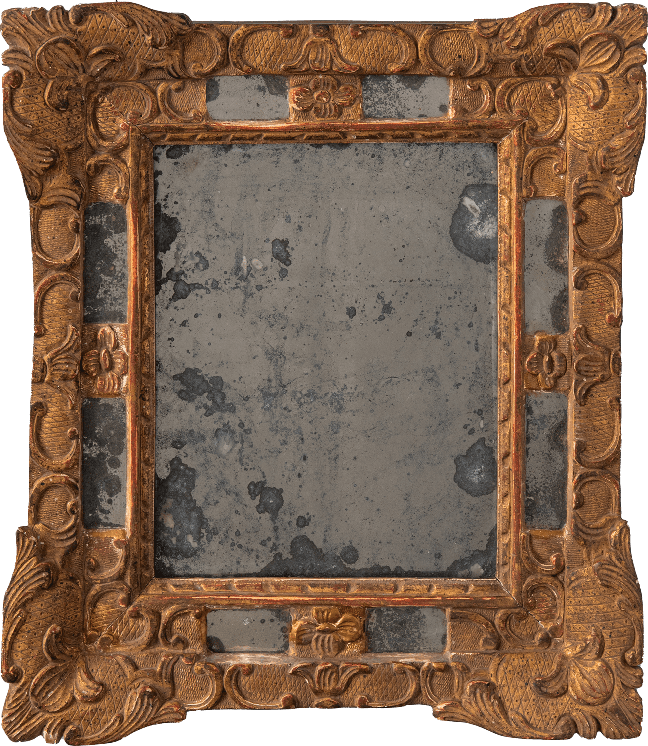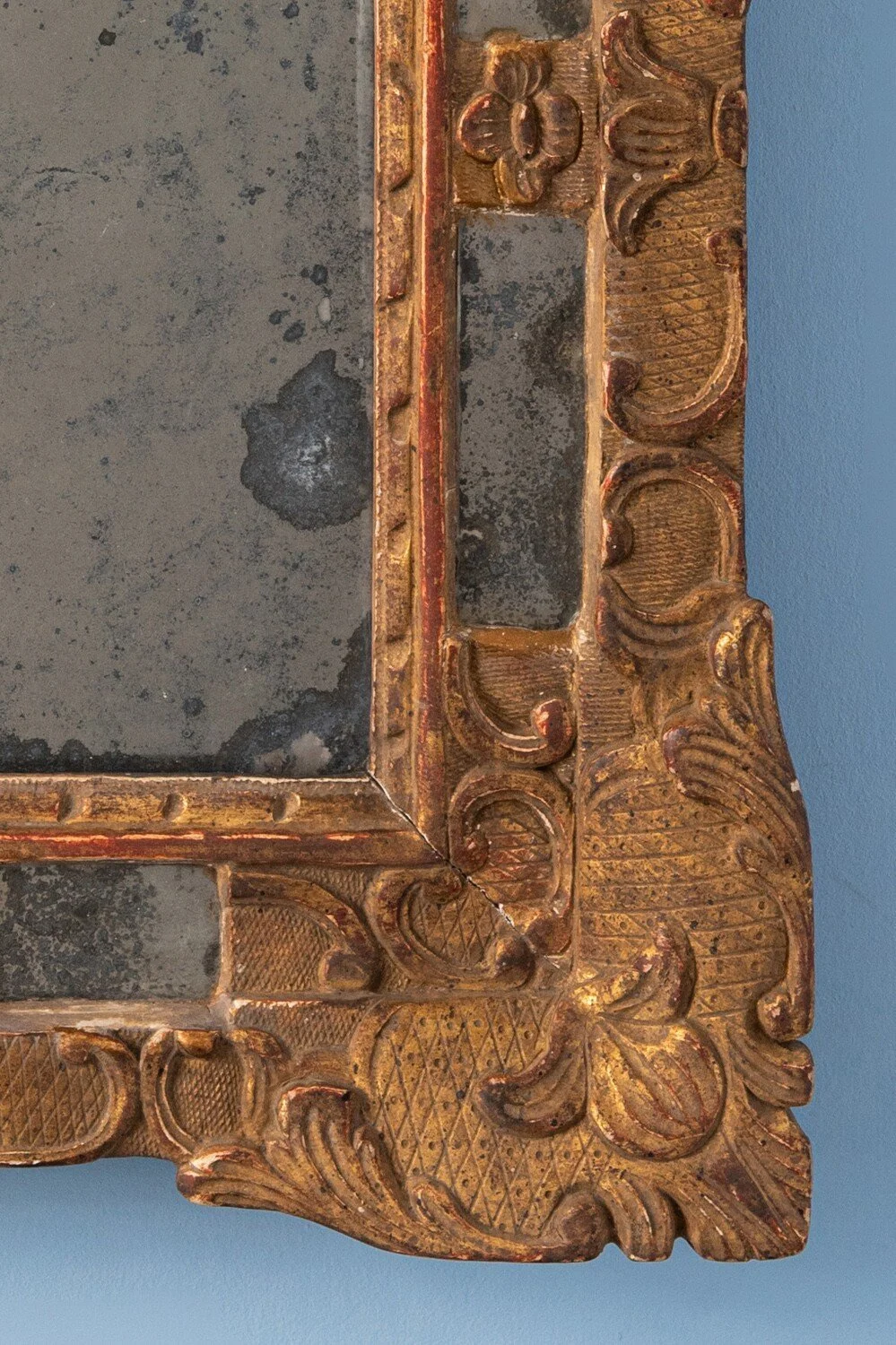 This 19th-century French giltwood mirror features a sumptuous crest of a lyre, surrounded by flowing scrolls of flowers and foliage. The rectangular mirror plate is adorned with an ornate frieze of relief flowers, finished with two pilasters at the bottom. The original mirror plate displays attractive foxing, adding character. This distinctive 19th-century mirror, composed of earlier elements, makes a unique statement piece.