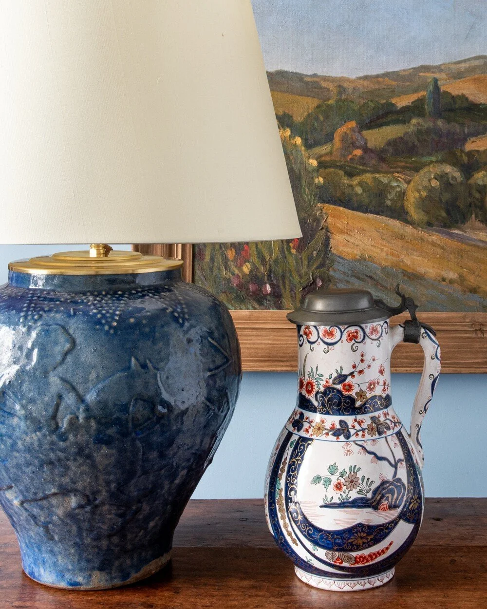 An early 20th-century oil painting on canvas depicting a woman seated at a table, reading a letter with a glove in hand. The sitter’s thoughtful pose creates an intimate, contemplative mood within a quiet interior, layered with a bold interplay of patterned textiles, vibrant artwork, and an African sculpture in the background. Decorative rhythm guides the eye across the composition, from the folds of the shirt to the sculptural forms of the hat, sculpture, and objects on the table. A restrained palette is heightened by accents of blue and red, and the luminous white of the shirt. The African sculpture and abstract artwork suggest an early modern sensibility, offering insight into the artistic world of the sitter.